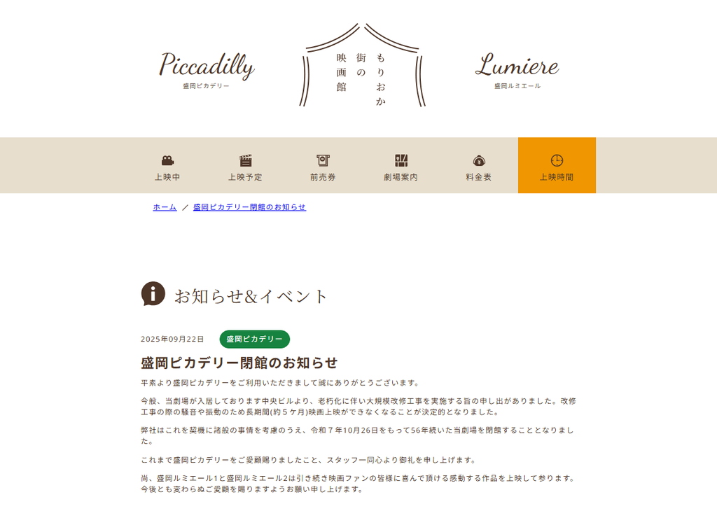 今回は、盛岡の映画館「ピカデリー」が、令和7年10月26日で閉館する、という話です。